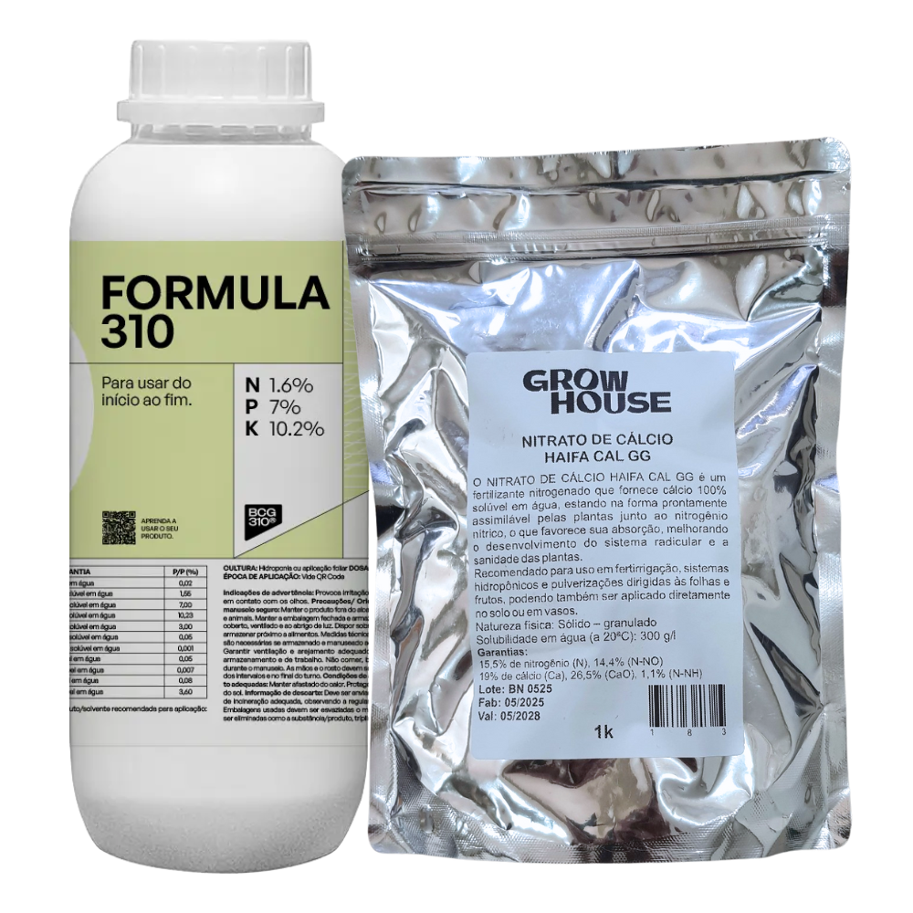 O Kit Fórmula 310 & Nitrato de Cálcio Haifa Cal™ GG combina dois fertilizantes de alta performance para fornecer nutrição completa, equilíbrio e máxima produtividade em todas as fases do cultivo. O Fórmula 310 entrega macro e micronutrientes essenciais (NPK, Mg, S, Fe, Zn, Mn e outros), enquanto o Haifa Cal™ GG garante cálcio e nitrogênio nítrico de rápida absorção. Juntos, promovem plantas mais vigorosas, resistentes e produtivas, ideais para cultivos indoor, hidroponia e fertirrigação.